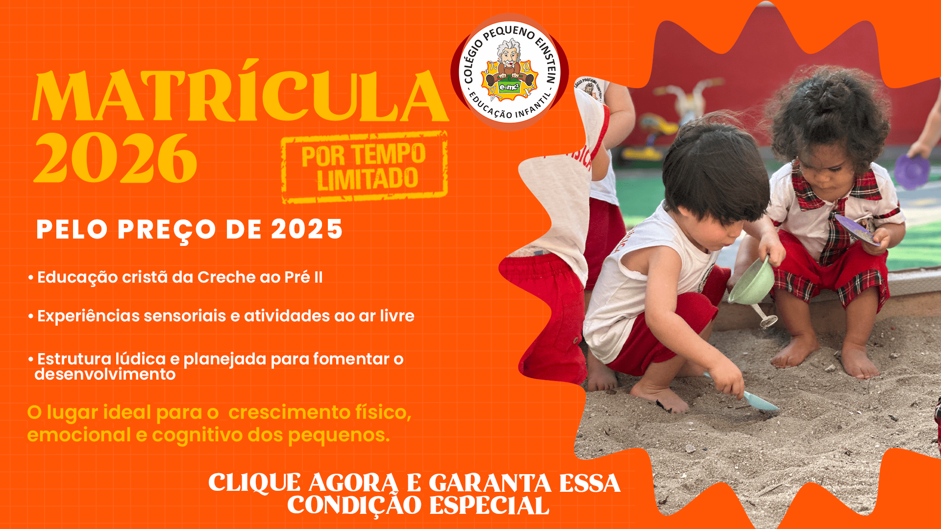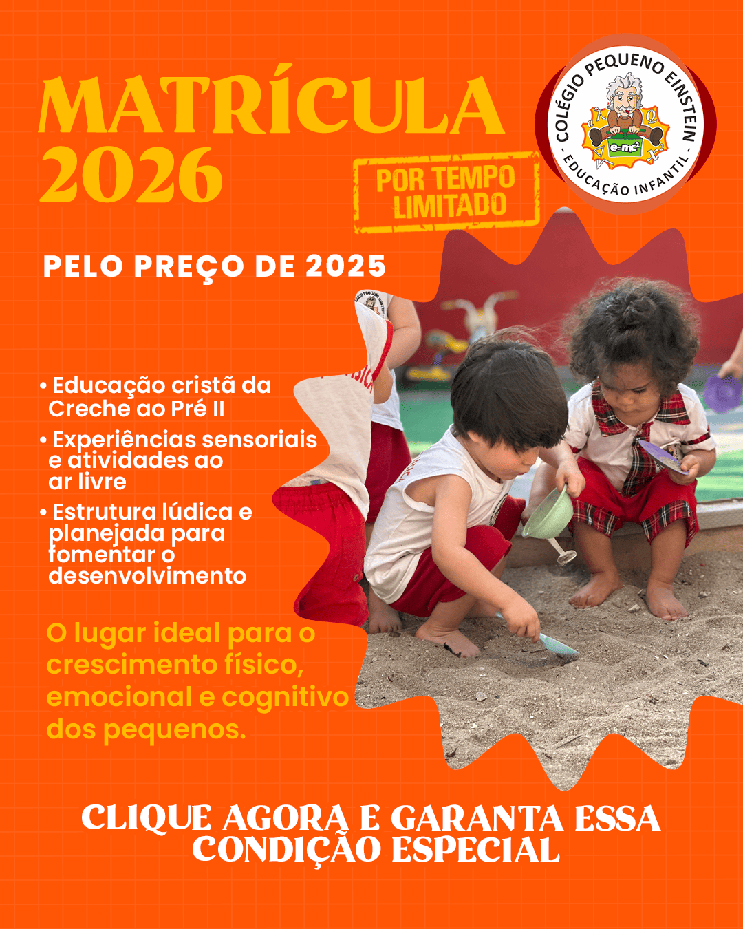 No Colégio Pequeno Einstein, acreditamos que cada criança é um presente único, pronta para explorar o mundo com curiosidade, criatividade e fé. Nossa missão é proporcionar uma educação de excelência, baseada em valores cristãos, que prepara nossos alunos para um futuro brilhante e cheio de propósito.
